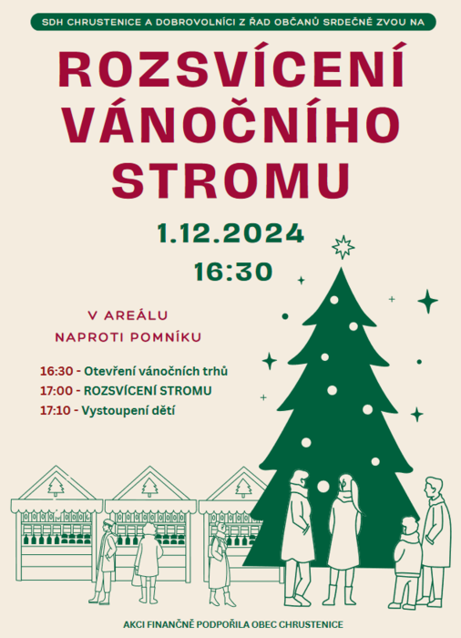 SDH Chrustenice a dobrovolníci z řad občanů srdečně zvou na rozsvícení vánočního stromu 1. 12. 2024 v areálu naproti pomníku.